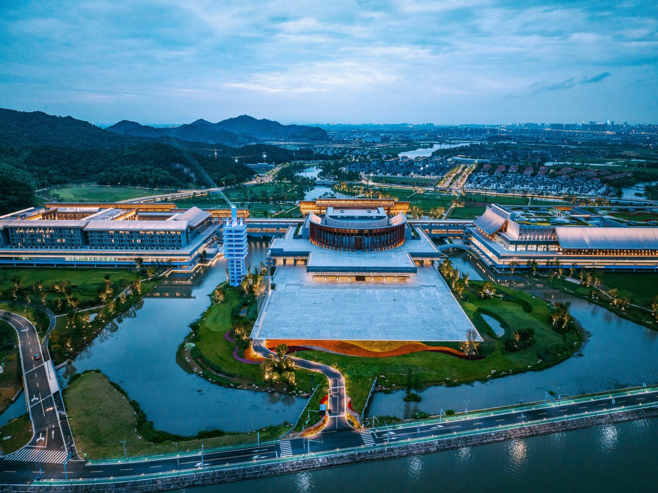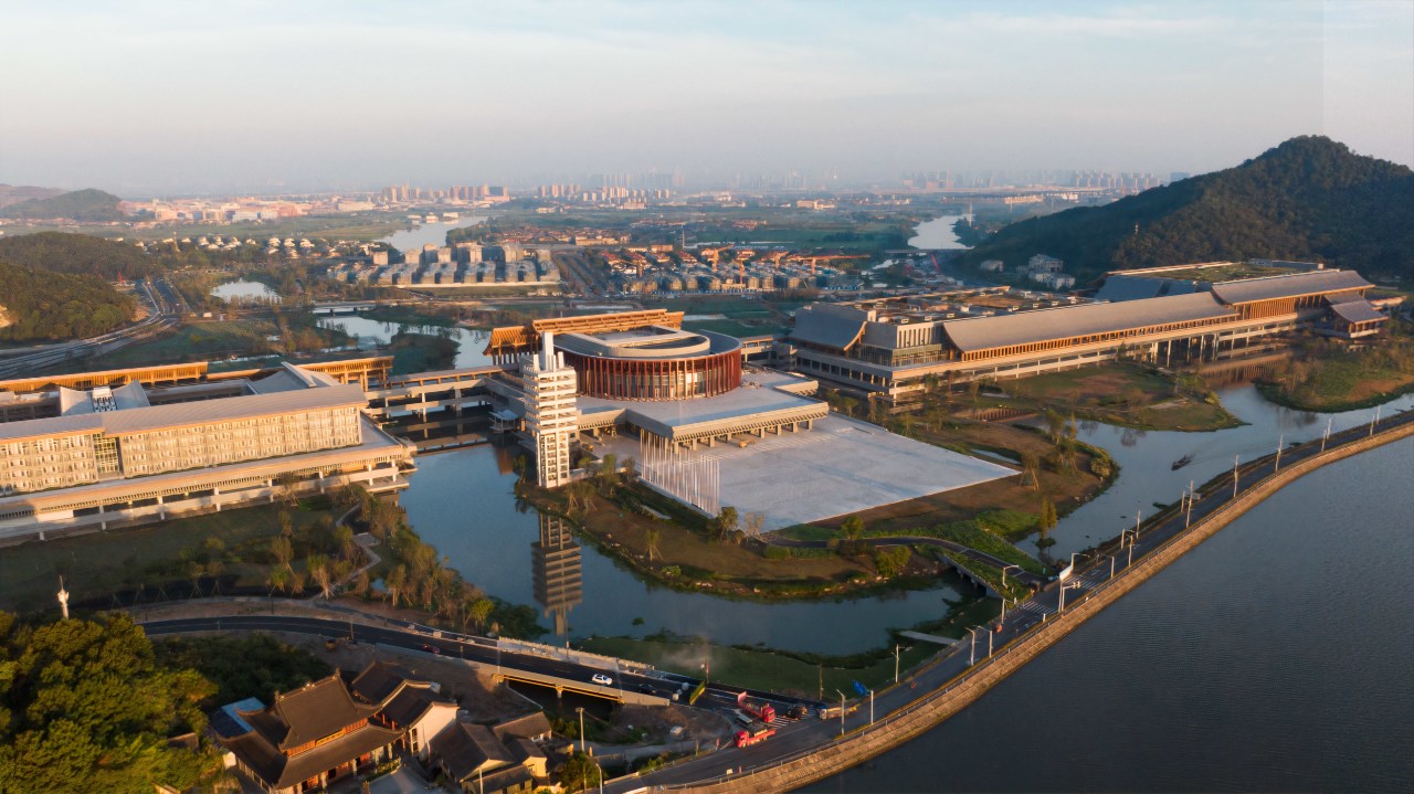 项目特色:建筑设计由国际知名设计师汤桦领衔,以浙东廊桥为基本元素,架空于场地河谷之上,横跨在两座山麓之间,整合所有功能。景观设计由杭州园林设计院承担,以强调自然的手法形成“山水相邀、阡陌乡愁”的总体景观风貌;设计以国际会议中心建筑为主体,形成了“一桥双望”的景观架构,建筑西侧景观强调水田特征,回望宁波老城,形成阡陌纵横的田园乡愁景致;建筑东侧景观突出湿地特色,眺揽钱湖群山,形成相邀山水、展望未来的绿色画卷。