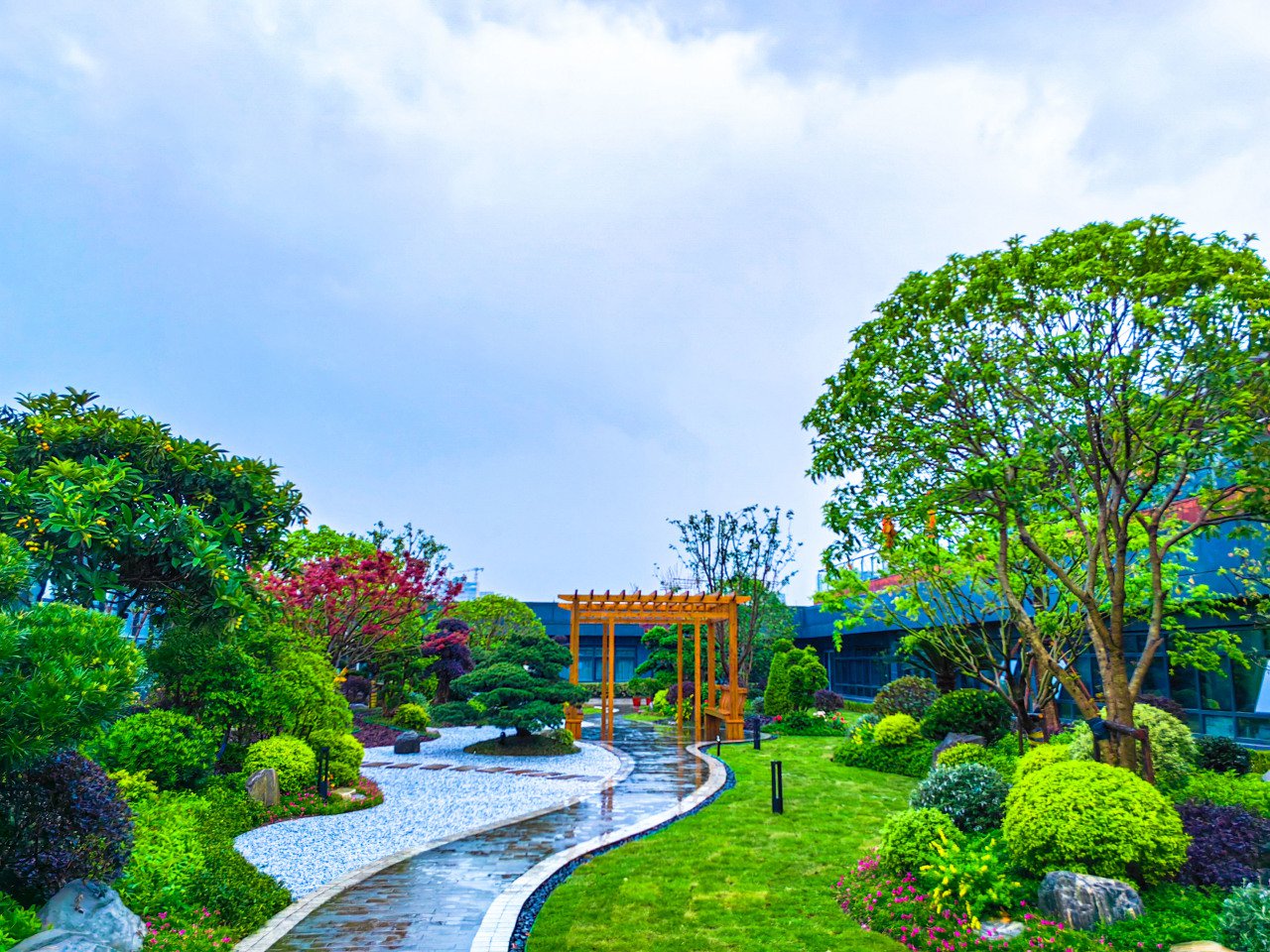 花园内种植了各种花草树木,如月季、玫瑰、紫薇、桂花、樱花、杜鹃等,形成了四季不断的花海。花园还设有喷泉、水池、亭台、长廊等景观,营造了一种优雅和谐的氛围。