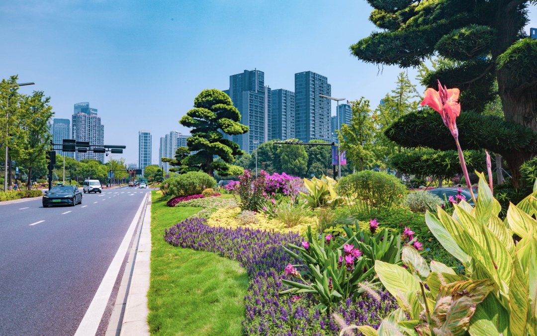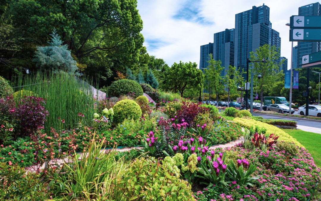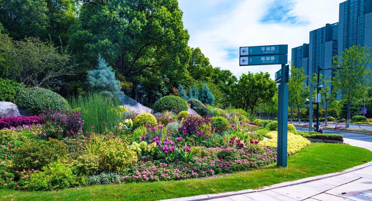 节点分为重要一级节点3处,二级节点16处,其中一级节点结合已设计的杭州亚运主题雕塑,对周边相邻绿地进行莳花点缀。二级节点主要为道路转角绿地,同路口几个转角采用相同的彩化提升方式及色彩搭配,形成统一整体的道路节点景观。