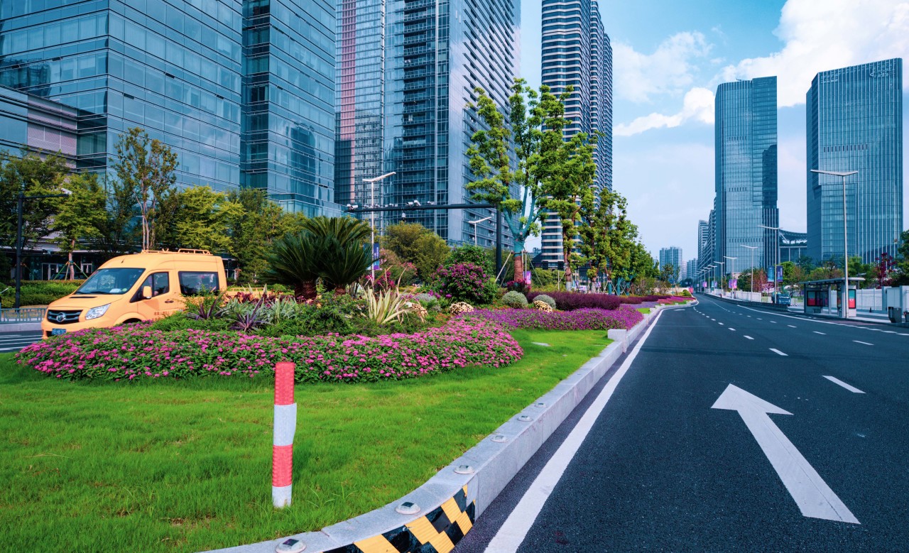 奔竞大道道路彩化段总长约 2800 米,以“奔竞不息,共奔亚运”为主题。提取亚运主题色: 映日红、红韵紫、水光蓝、月桂黄。通过微地形、造型松、置石点缀及曲线韵律的莳花色带,结合现有亚运主题城市雕塑配置花境,营造精致的景观效果。