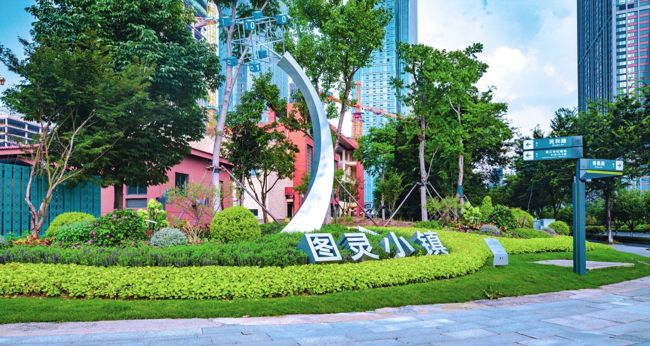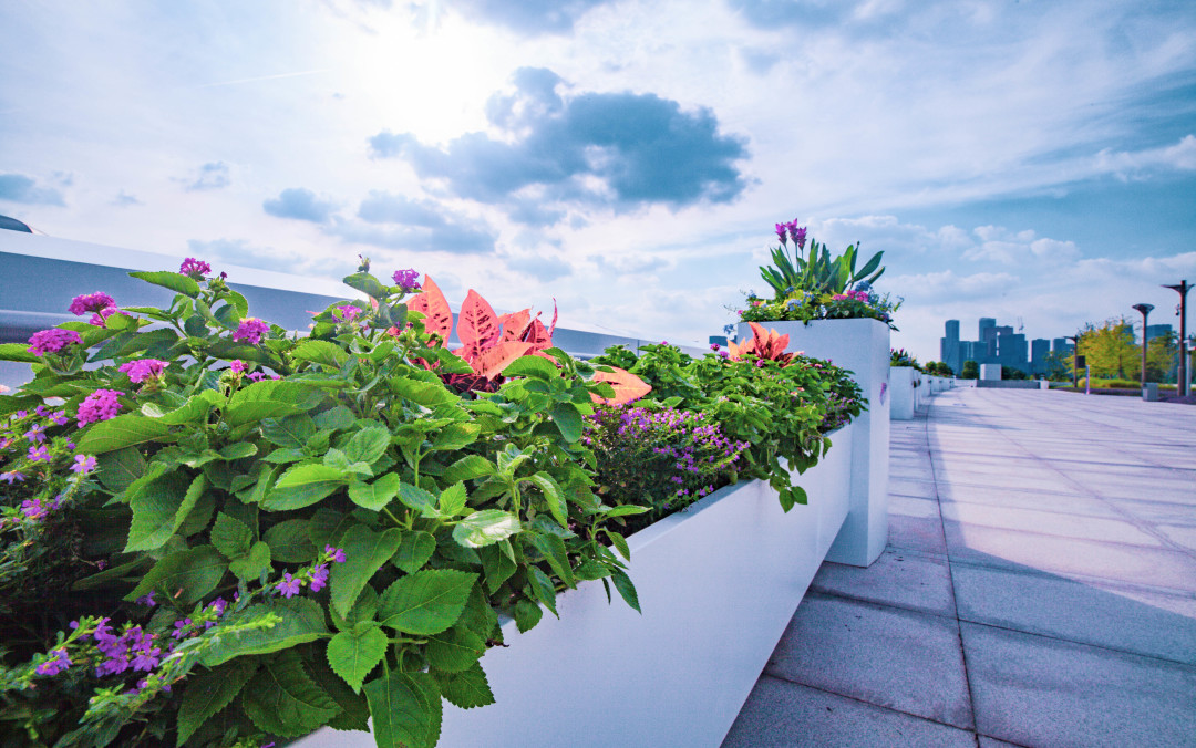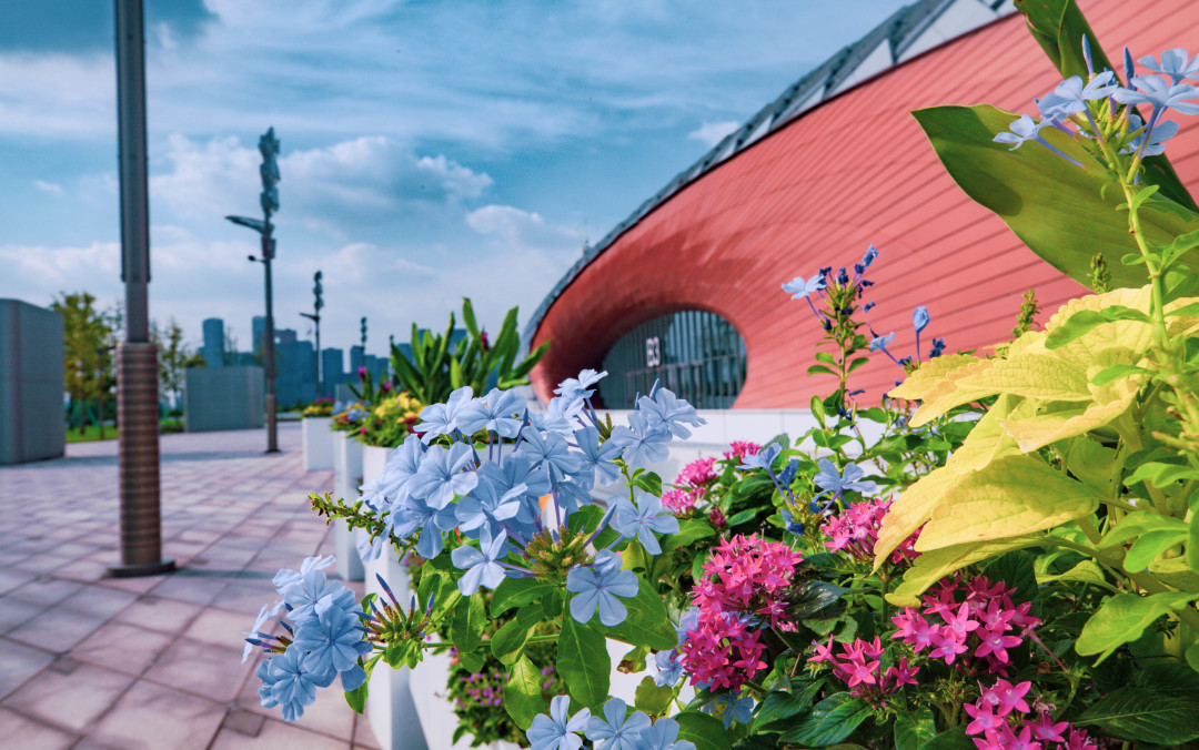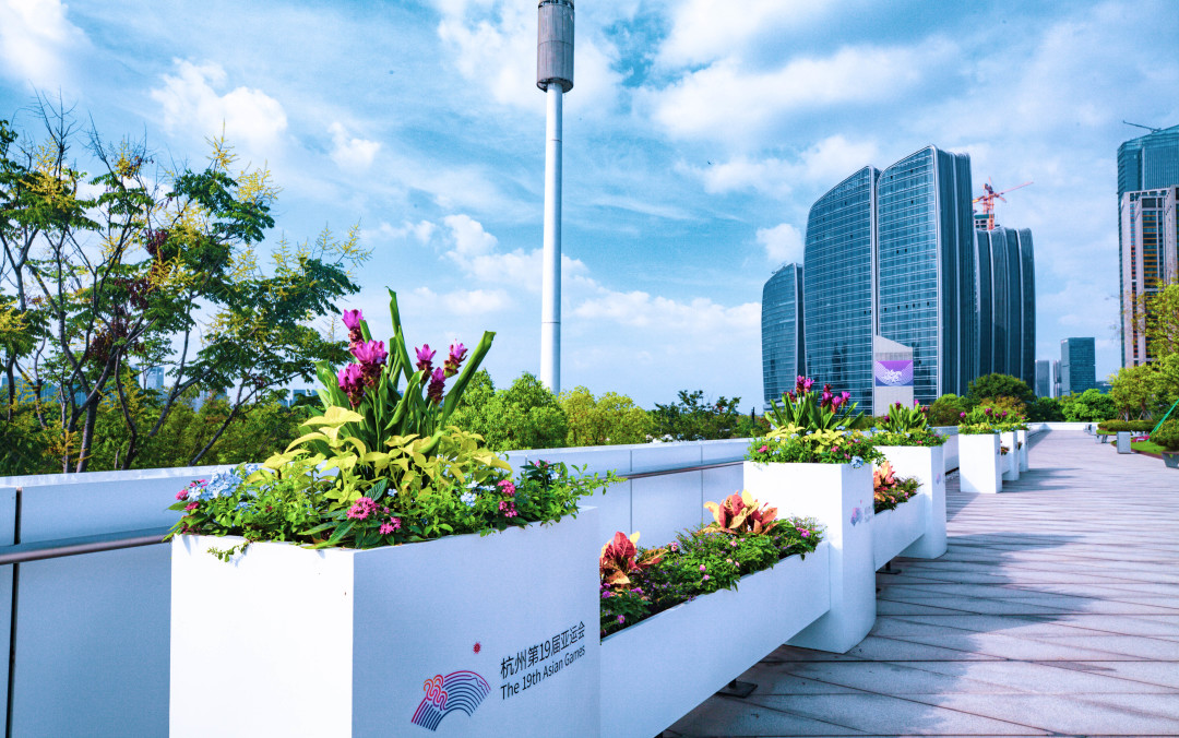 (2)二层平台结合现有雕塑布置花境植物组团、结合现有种植池布置整体统一的莳花色带、结合平台栏杆及建筑底部布置亚运主题花箱,烘托亚运氛围。