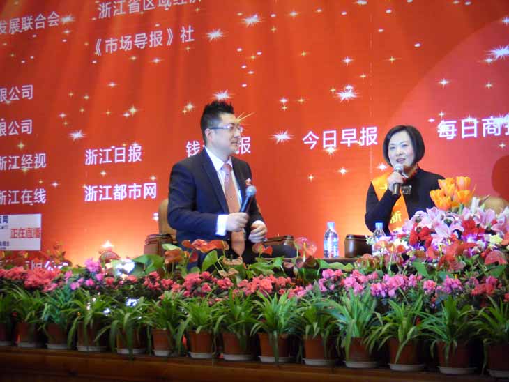 卢条英(右)被评为浙商女杰时接受记者采访