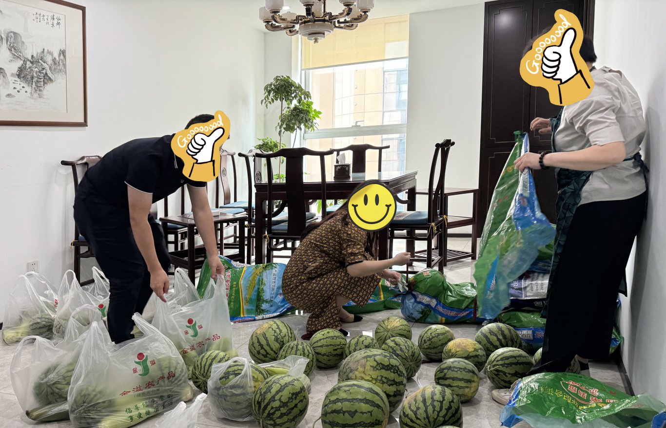 由于高温下工作容易流失体内水分和电解质,因此,公司精心准备了集团农业基地产的西瓜和玉米,为员工们补充能量,解渴降温。