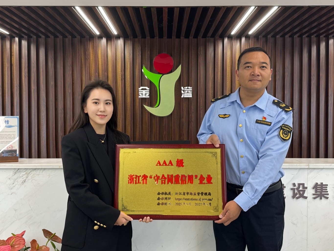 2025年10月22日下午,区市场监督管理局北干所所长姜纪刚一行莅临杭州金溢建设集团有限公司,将象征企业诚信经营最高荣誉的浙江省AAA“守合同重信用”企业铜牌及证书授予集团。集团总裁赵淑洋代表企业接受这一殊荣。
